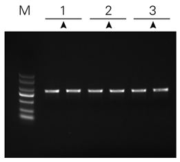 ![]() | 注解:三個月穩(wěn)定性實驗結(jié)果圖 柑橘內(nèi)參基因GAPDH 1kb擴增結(jié)果 RNA使用量為50 ng 1:4℃保存 2:37℃保存 3:-20℃保存 M:莊盟DL2000(3μl點樣) |