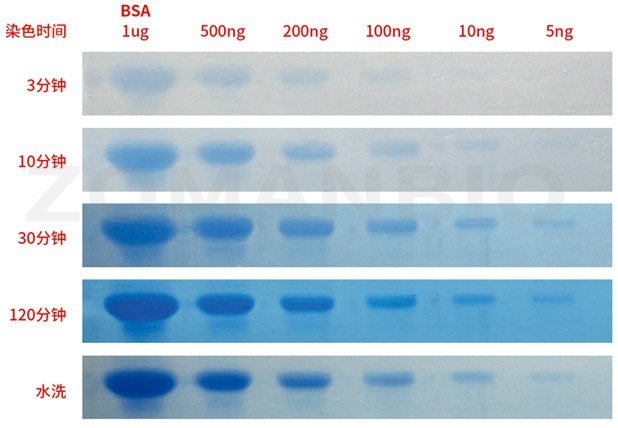 泡染2-10min即可觀察蛋白大??;且安全無毒無刺激性氣味。