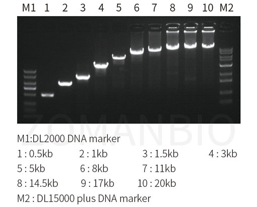 (1)玉米基因組DNA模板,分別擴增0.5kb、1kb、1.5kb、3kb、5kb、8kb、11kb、14.5kb、17kb、20kb片段